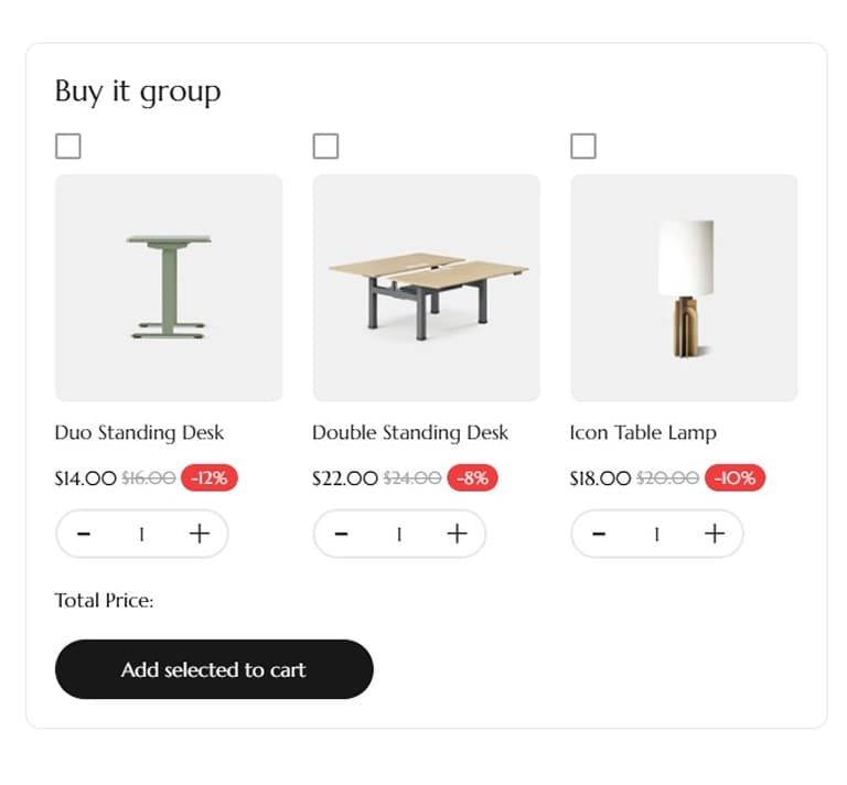 Shows related products often purchased as a group, helping increase order value with quick bundle buying.