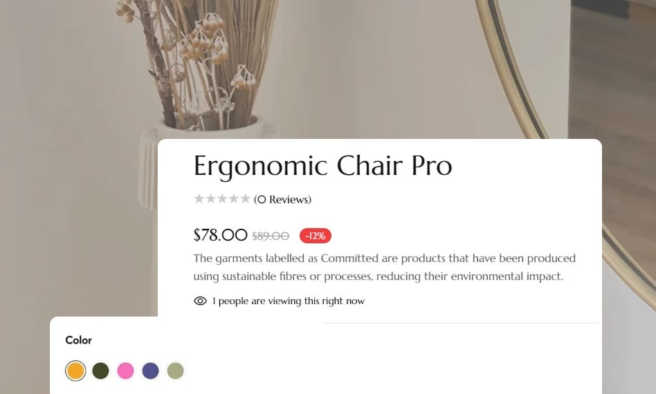 Show product variations such as color, size, etc., using swatches. No need for extra apps – built-in and easy to customize.