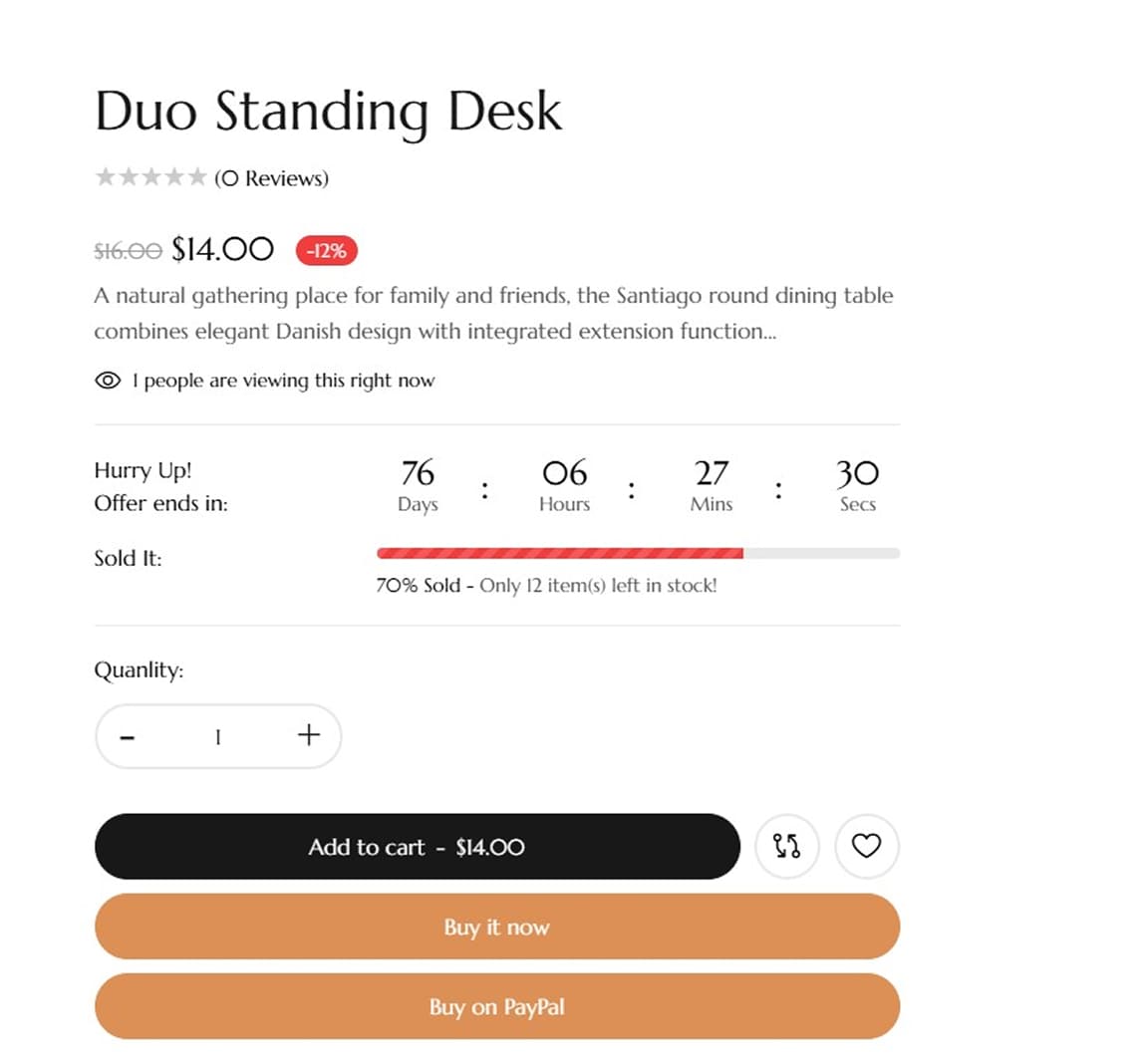 Displays the offer timer and sold stock, creating urgency and encouraging quicker purchases.